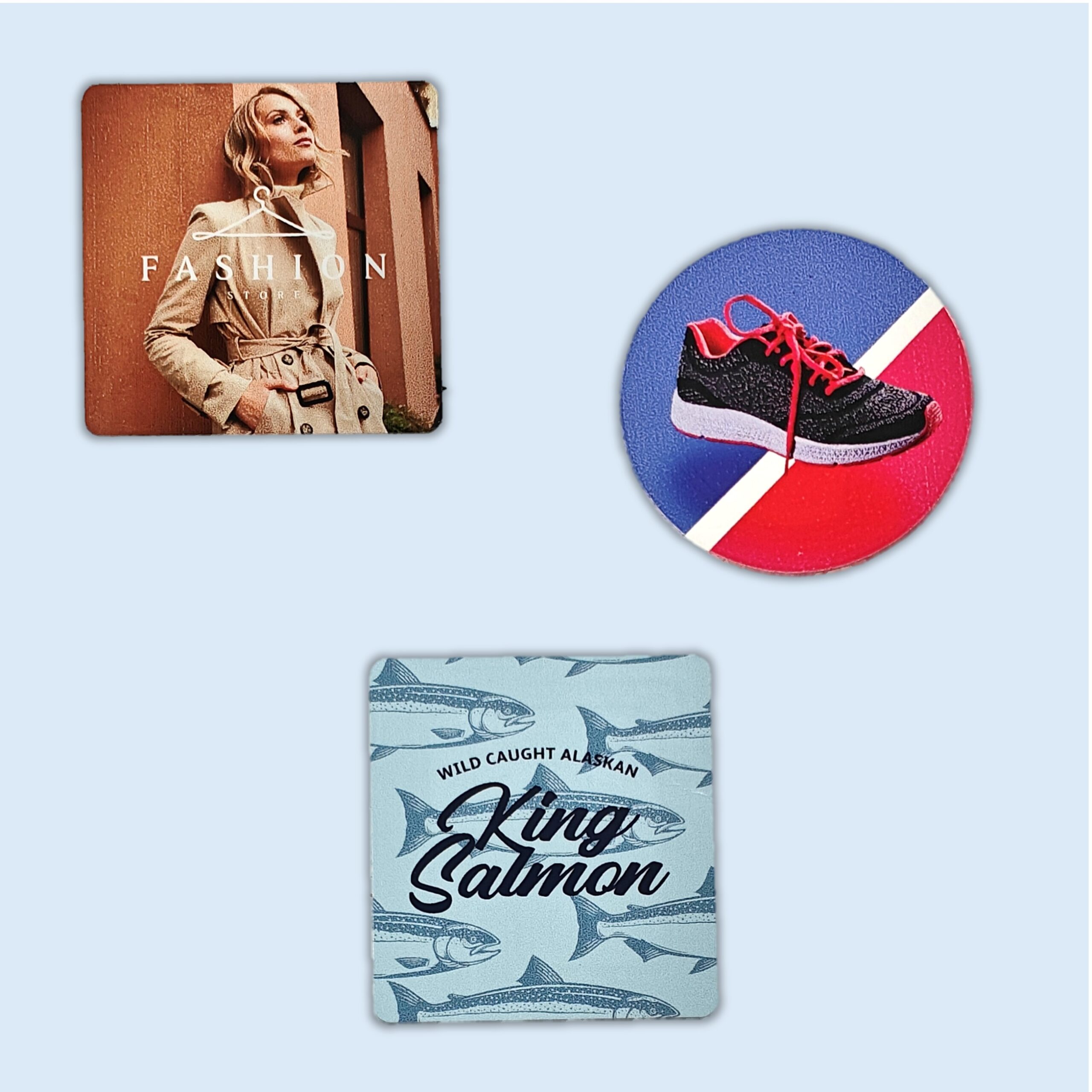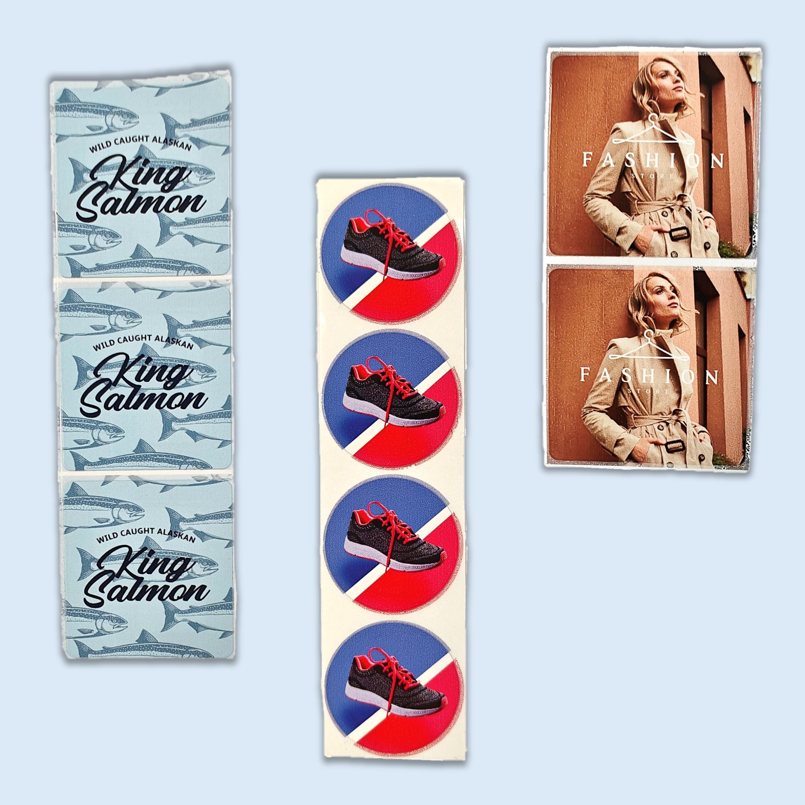 Etiketterna finns i både runda och fyrkantiga format samt i olika storlekar. Det finns flera olika storlekar och format att välja mellan, så att man kan få precis den etikett som passar den specifika typ av vara den ska sitta på.